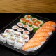6 vegetarian Californian with raw tuna top, 6 vegetarian Californian with salmon top, 6 vegetarian Californian with mango top, 6 vegetarian Californian with avocado top, mayo and sesame seeds, 1 mango pink, 1 salmon pink, 1 tuna pink